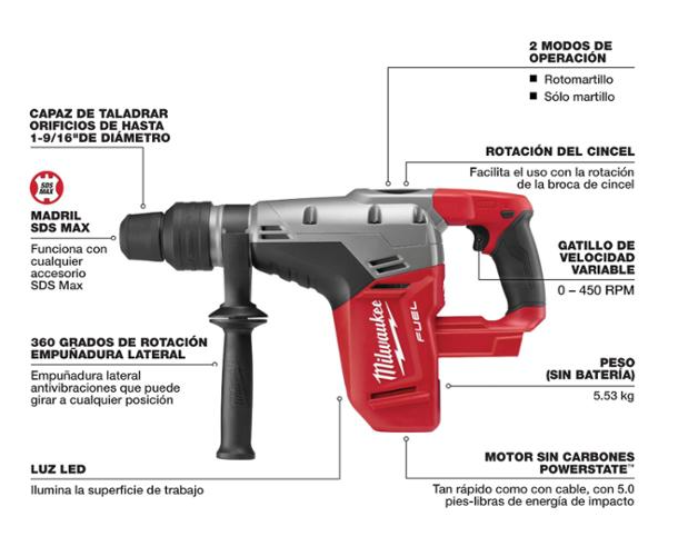 El martillo rotativo SDS Max M18 FUEL™ de 1-9/16″ es la primera solución inalámbrica SDS Max de 18 V en el mundo. Ya que utiliza la tecnología exclusiva M18 FUEL™, el martillo rotativo SDS Max de 1-9/16″ puede perforar tan rápido como el martillo rotativo SDS Max con cable; ofrece la misma durabilidad que el producto con cable y brinda más de 20 minutos de cincelado continuo. El motor sin escobillas POWERSTATE™ ofrece 5 pies-lb de energía de impacto para las aplicaciones más exigentes de servicio pesado. Como la perforación de núcleo en seco y el cincelado para servicio mediano en bloques de hormigón y en hormigón reforzado.